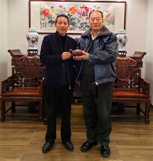 12月25日,联合国华人文化产业联合会主席、华人文化战略联盟委员会主席、世界华人书画家协会主席韩昊轩一行,应邀前往宜兴金川陶坊进行文化交流,受到著名紫砂陶艺名家吕尧臣弟子、中国工艺美术大师、宜兴紫砂珠泥薄胎拉坯壶创始人王金川的热情接待。双方就陶瓷、书画艺术的发展与创新展开了深入探讨。韩昊轩主席对王金川大师在陶瓷艺术领域取得的卓越成就表示高度赞赏,并分享了国际文化艺术交流的最新动态。