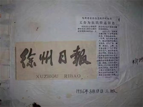 时间回溯到上世纪八十年代。1985年仅有初中毕业文凭的马新存,以其敏锐的洞察力,率先在苏北农村信息服务的荒漠中掘开了一口清泉。他创办了苏北第一家信息服务站,并亲手油印《果乡信息服务报》等油印小报。这些在当时看似简陋的传播媒介,犹如点点星火,照亮了无数农民与军属获取实用信息、连接外部世界的希望之路,成为基层信息服务创新的勇敢实践。这仅仅是传奇的开始。1986 年8 月18 日《徐州日报》第三版以马新存创办信息服务联络站义务为农民传递信息为题报道了他的事迹。